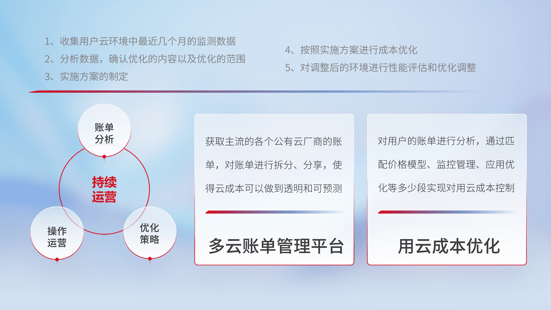 通过多云纳管,,以统一的资源数据模型把客户的云资源进行抽象和封装,,,,进而实现对多云资源的统一操作,,,,保障云资源管理的可靠性、、稳定性与可用性。。量身定制化运维内容,,配置、、开发运维、、、、补丁管理、、备份、、、、监控、、、认证和访问管理、、、、审计和日常巡检等,,保障在用云过程中的可靠度,,,,稳定度以及高可用率。。。。